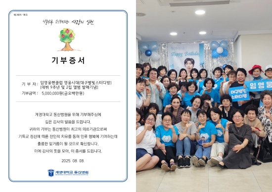 한편, '대구별빛스터디방'은 이번 기부를 포함해 현재까지 계명대학교 동산병원에 총 2,100만 원을 후원했다.