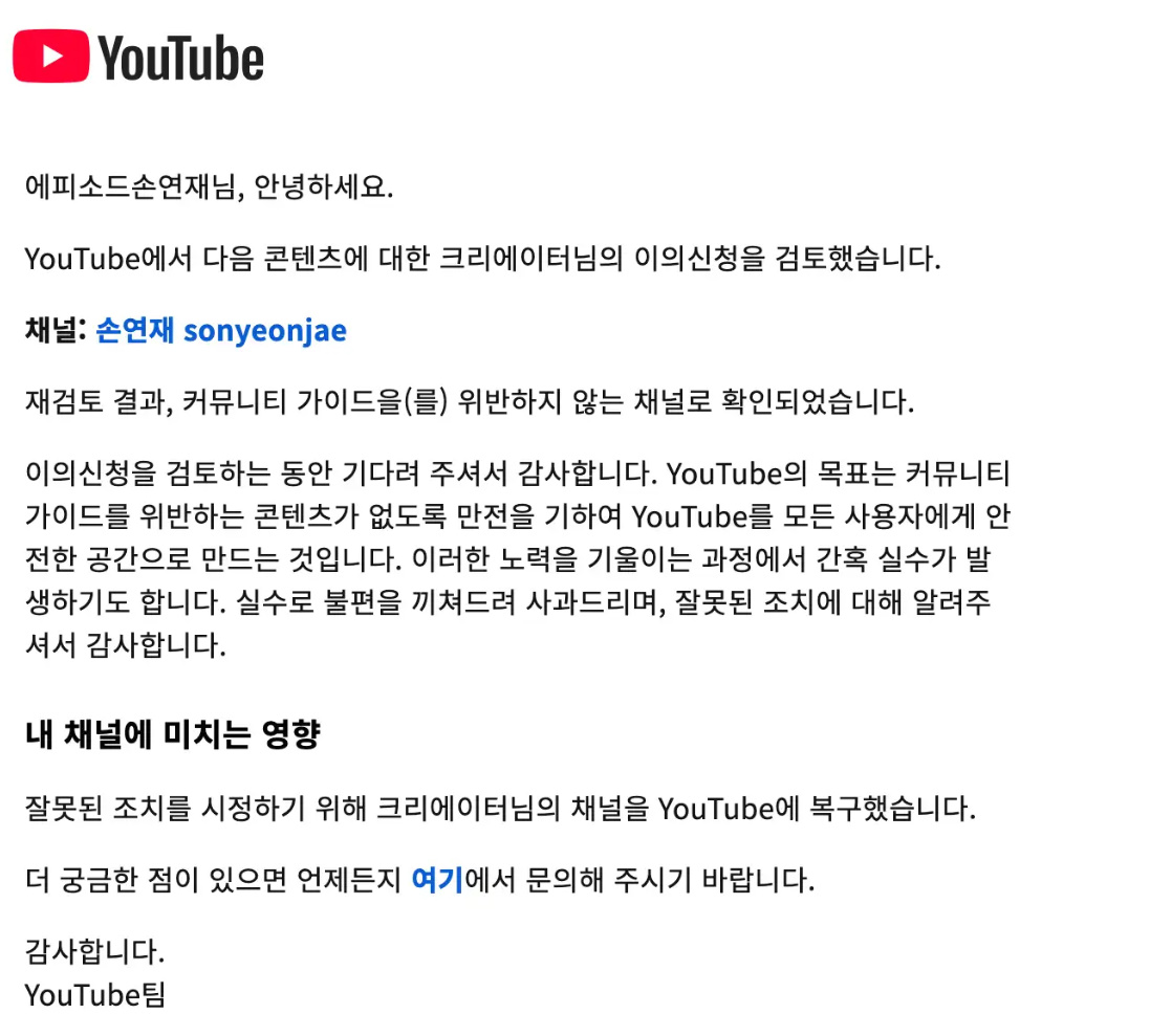 유튜브 측은 "재검토 결과, 커뮤니티 가이드를 위반하지 않는 채널로 확인됐다"며 "노력을 기울이는 과정에서 간혹 실수가 발생하기도 한다. 실수로 불편을 끼쳐드려 사과드리며 잘못된 조치에 대해 알려주셔서 감사합니다"고 사과했다.