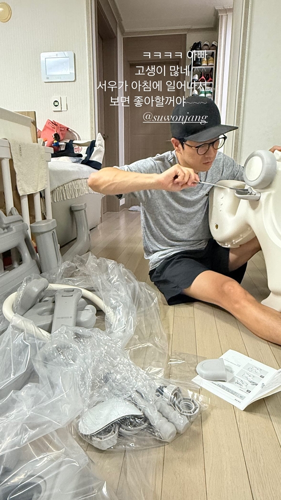 사진 속 장수원은 집 바닥에 앉아 장난감 말 모양 놀이기구를 조립하고 있다. 설명서를 옆에 두고 부품을 맞추는 그의 표정에서 세심함과 집중력이 엿보인다. 주변에는 조립 전 부품들이 비닐에 담긴 채 놓여 있어 작업의 규모를 짐작하게 한다.