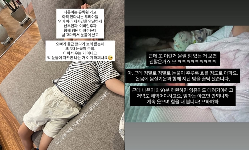 이어 병원에 동행한 아들의 사진과 함께 "나은이는 유치원 가고 아직 안 다니는 우리 아들 엄마 따라 세 시간을 얌전하게 산부인과, 이비인후과 함께 병원 다녀주는데 넘 고마워서 눈물이 났고, 오빠가 출근했다가 보러 왔는데 또 2차 눈물이 주룩"이라며 "아파서 우는 거 아니고 막 눈물이 자꾸만 나는 거 이거 어쩌나요"라고 덧붙였다.