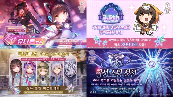 '헤븐 번즈 레드'의 출시 3.5주년을 기념한 이벤트도 함께 진행된다. 먼저, 9월 1일까지 게임에 접속하는 모든 이용자에게 '쿼츠' 3,000개를 지급한다. 또한, 8월 11일부터 9월 15일까지 매주 초기화되는 '3.5th Anniversary 기간 한정 미션'을 통해 'S 이상 확정 뽑기 티켓'과 '만능 스타일 피스(SS)'를 획득할 수 있다.