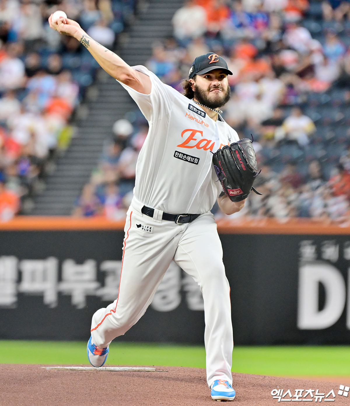 (엑스포츠뉴스 대전, 김한준 기자) 12일 오후 대전 한화생명 볼파크에서 열린 '2025 신한 SOL Bank KBO리그' 롯데 자이언츠와 한화 이글스의 경기, 1회초 한화 선발투수 폰세가 공을 힘차게 던지고 있다.