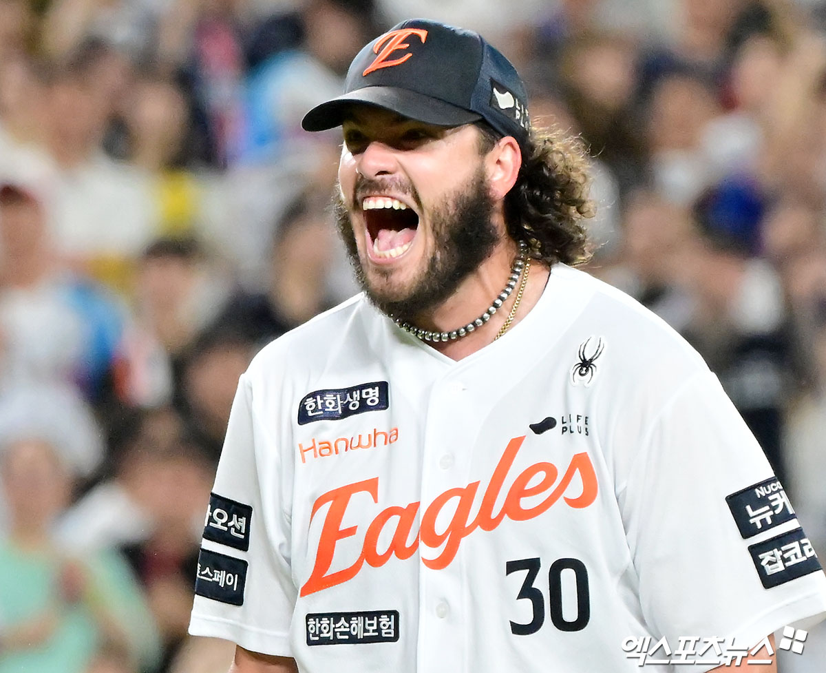 (엑스포츠뉴스 대전, 김한준 기자) 12일 오후 대전 한화생명 볼파크에서 열린 '2025 신한 SOL Bank KBO리그' 롯데 자이언츠와 한화 이글스의 경기, 5회초 수비를 마친 한화 폰세가 포효하고 있다.