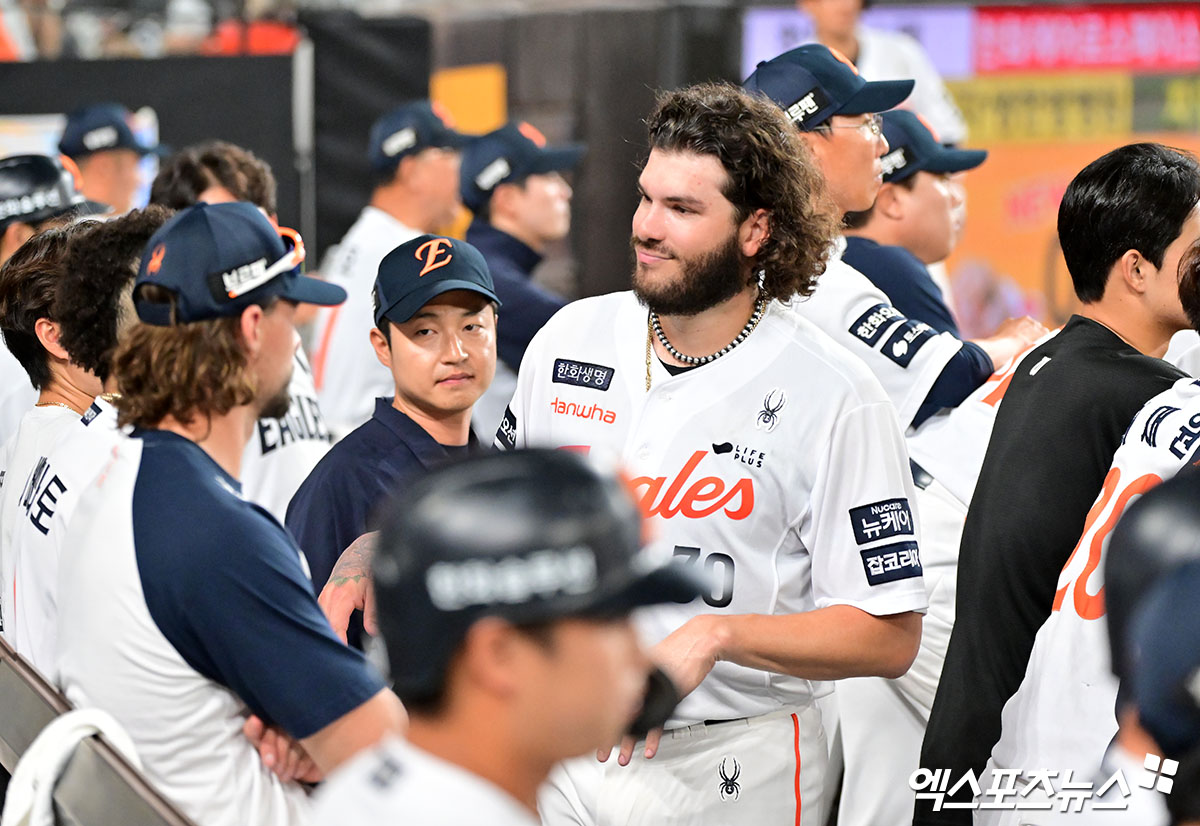 (엑스포츠뉴스 대전, 김한준 기자) 12일 오후 대전 한화생명 볼파크에서 열린 '2025 신한 SOL Bank KBO리그' 롯데 자이언츠와 한화 이글스의 경기, 7회초 수비를 마친 한화 폰세가 선수들의 격려를 받고 있다.