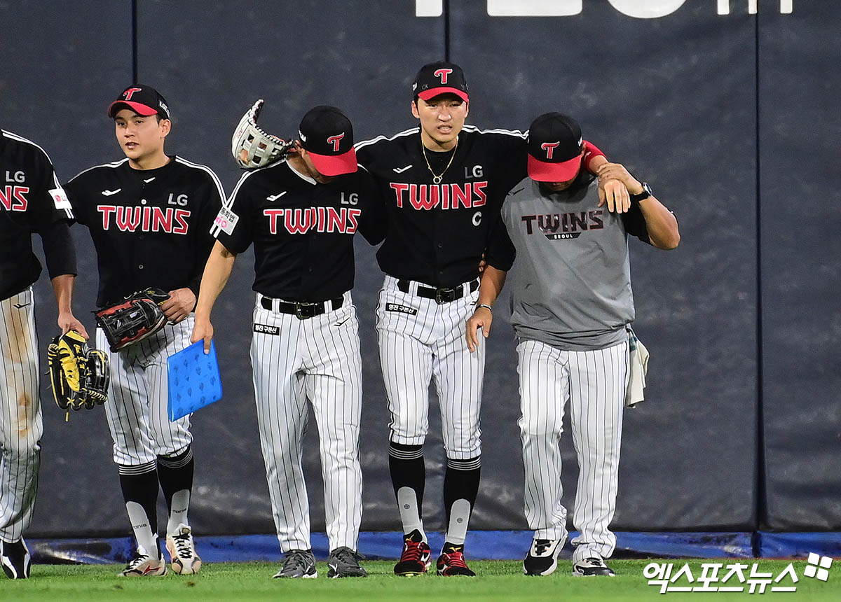 (엑스포츠뉴스 수원, 박지영 기자) 12일 오후 수원케이티위즈파크에서 열린 '2025 신한 SOL Bank KBO리그' LG 트윈스와 KT 위즈의 경기, 8회말 2사 1,2루 KT 오윤석의 2타점 적시 3루타 때 LG 중견수 박해민이 수비 이후 다리 통증을 호소, 트레이너에게 부축을 받으며 그라운드를 빠져나오고 있다.