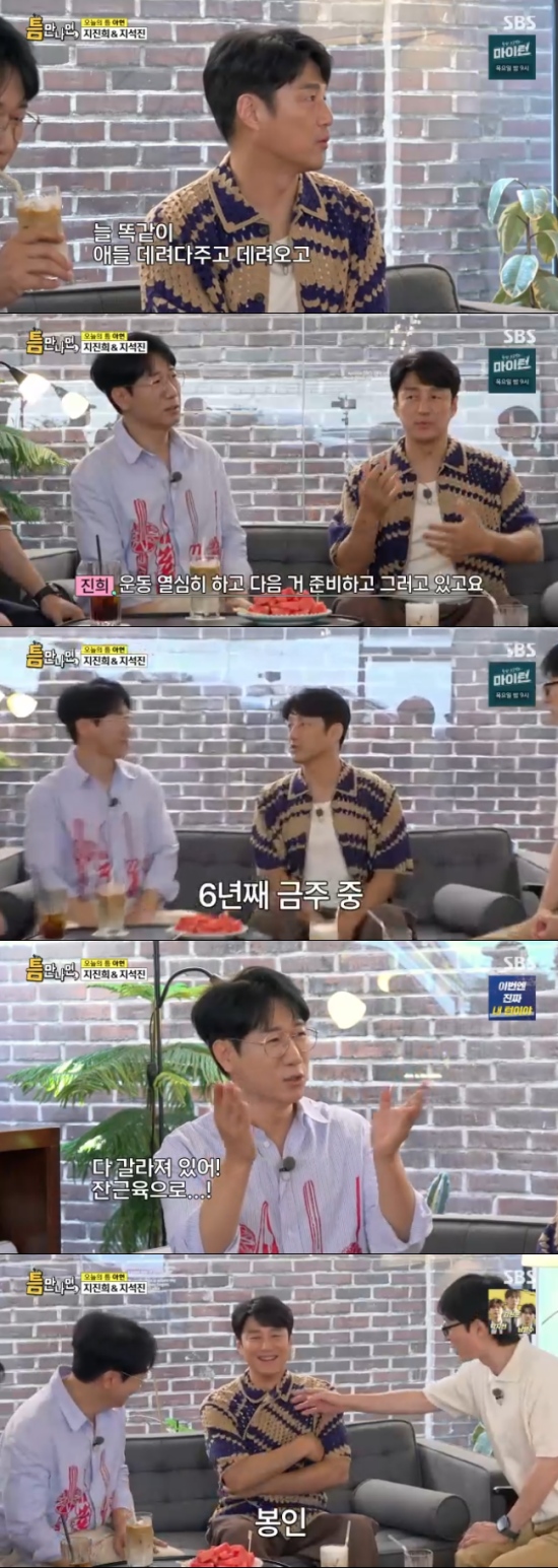 지진희는 자신의 근황을 전하면서 "저는 일상이 똑같다. 아이들 등하원을 시켜주고, 일도 하고, 운동도 하면서 지낸다. 그리고 6년 째 금주 중"이라고 했다. 이에 지석진은 "진희 몸을 본 적이 있냐. 잔근육으로 다 갈려져있다"고 덧붙였다.