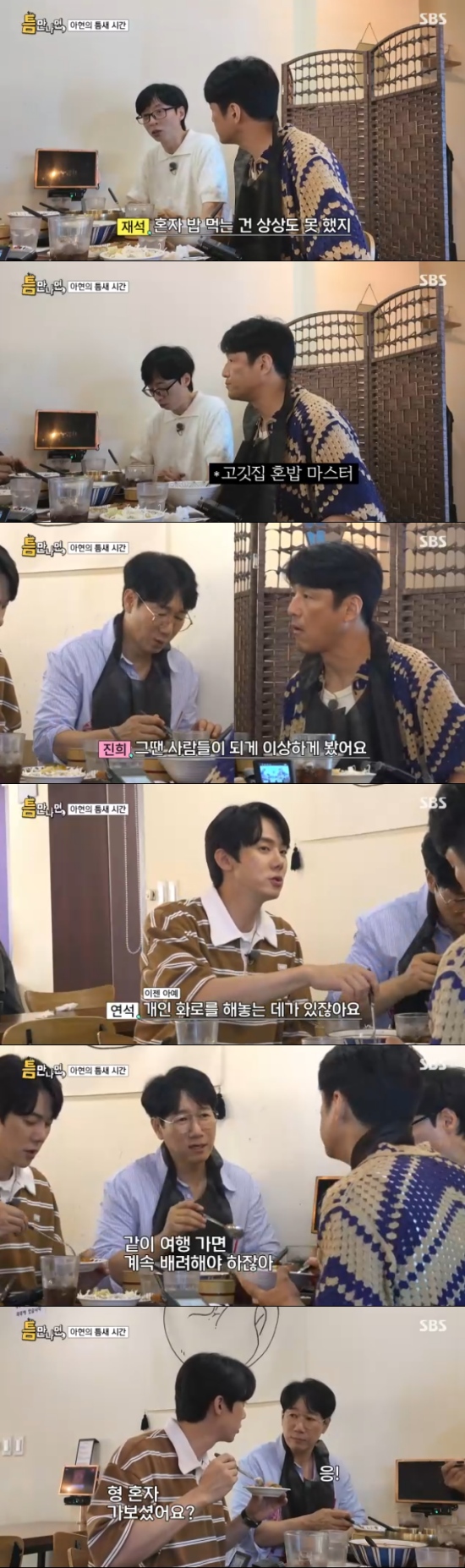 이후 이들은 '틈 주인'이 추천한 식당으로 점심을 해결하기 위해 이동했다. 그 가게는 혼밥족들을 위한 자리가 많이 마련되어 있었다. 이를 본 유재석은 "예전에는 혼자 밥을 먹는건 상상 못했다"고 했다.