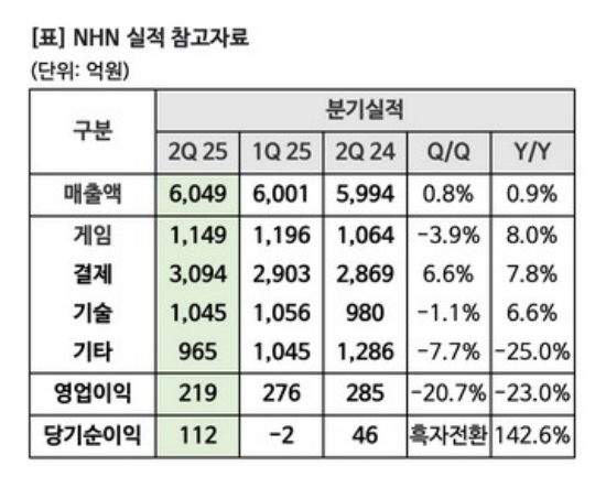 최근 NHN(대표 정우진)은 2025년 2분기 실적을 발표했다고 밝혔다.