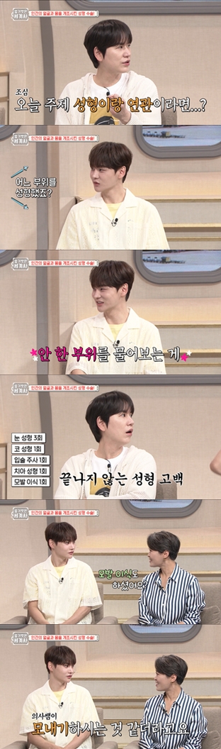 은지원은 "하도 이제 본인이 말씀을 많이 하고 다니셔서 여쭤보겠다"면서 "어디 어디 하셨냐"라고 성형 수술 부위를 궁금해했다.
