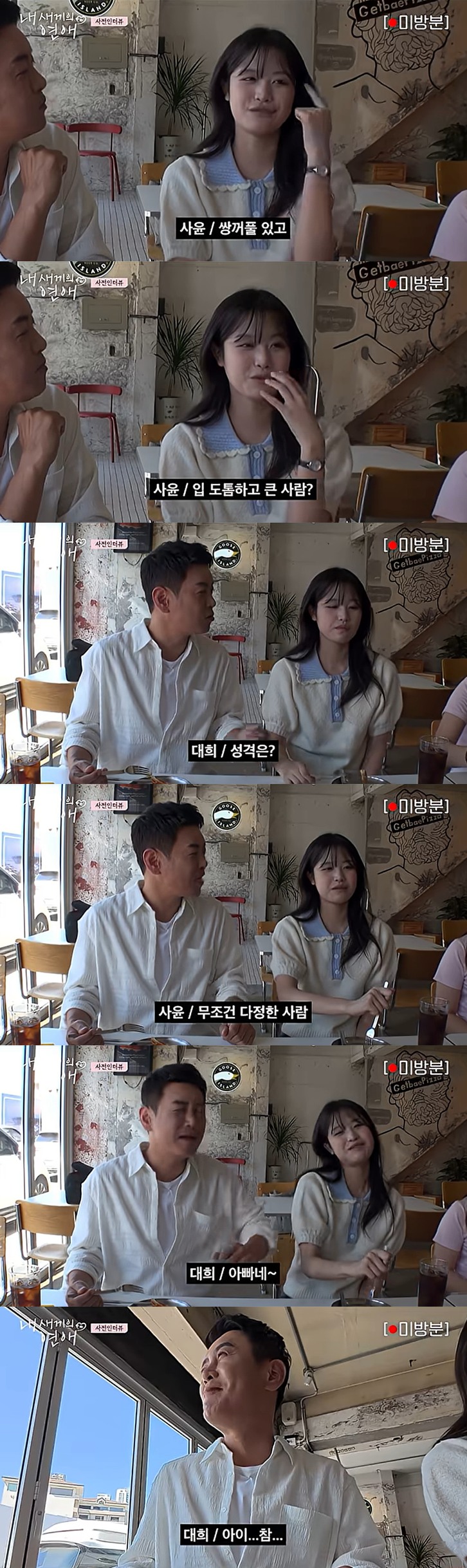 제작진이 "아빠같은 사람이 이상형이라고"라며 사윤에게 묻자 김대희는 미소를 숨기지 못하는 모습을 보였다.