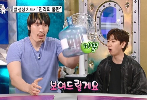이어 그는 마치 1.3L짜리 생수병을 잡듯 한 손으로 들고 마시는 장면을 선보여 모두를 깜짝 놀라게 한다.