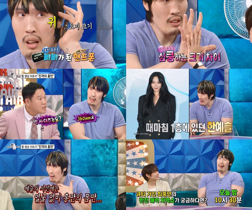최근 10대 팬들 사이에서 ‘착시 효과 짤’로 ‘밈의 황제’에 등극한 최홍만은 ‘라디오스타’에서 모든 것을 작게 만드는 ‘홍만 효과’를 제대로 보여준다.