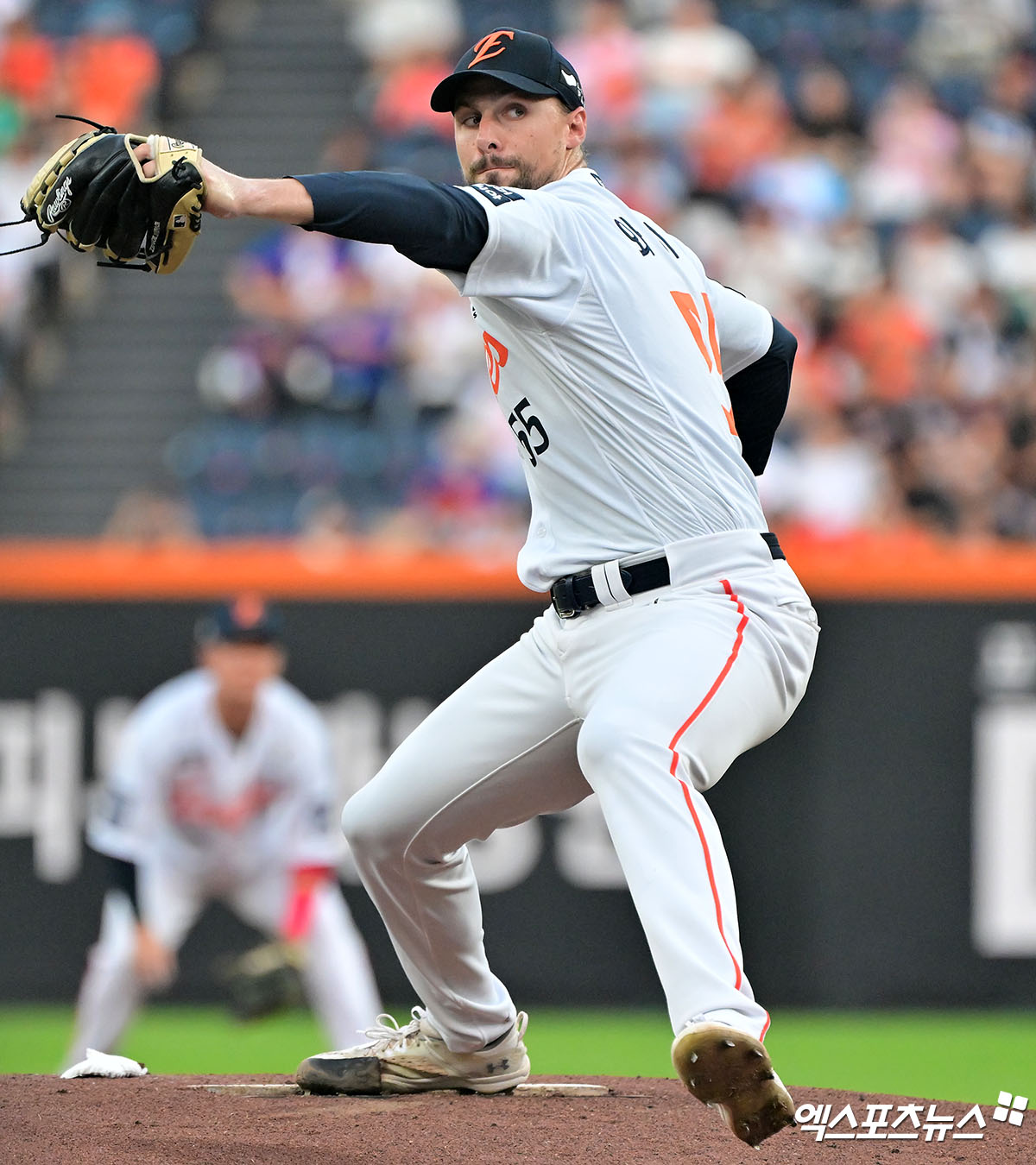 (엑스포츠뉴스 대전, 김한준 기자) 13일 오후 대전 한화생명 볼파크에서 열린 '2025 신한 SOL Bank KBO리그' 롯데 자이언츠와 한화 이글스의 경기, 1회초 한화 선발투수 와이스가 공을 힘차게 던지고 있다.