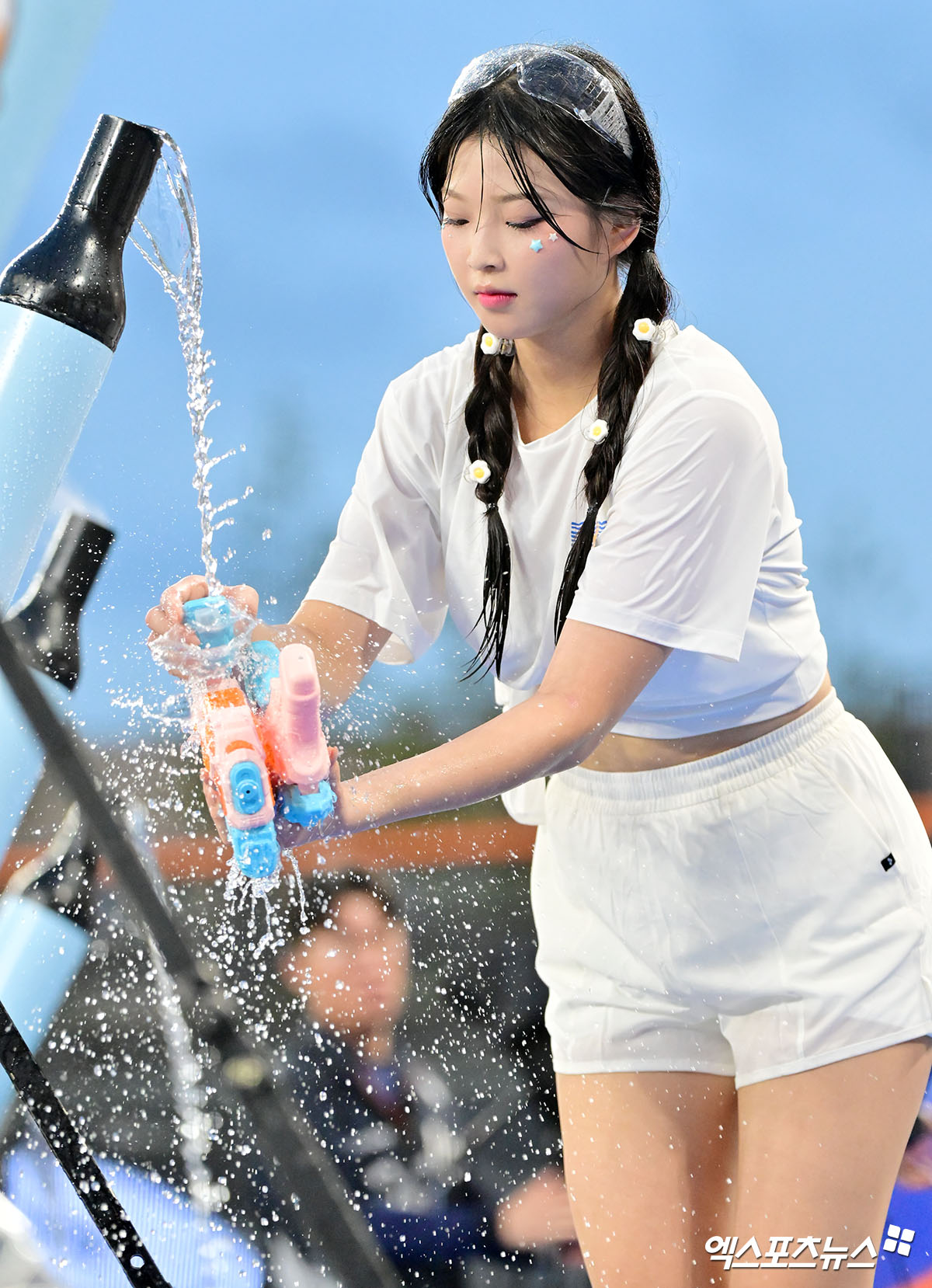 (엑스포츠뉴스 대전, 김한준 기자) 13일 오후 대전 한화생명 볼파크에서 열린 '2025 신한 SOL Bank KBO리그' 롯데 자이언츠와 한화 이글스의 경기, 최석화 치어리더가 물을 받고 있다.