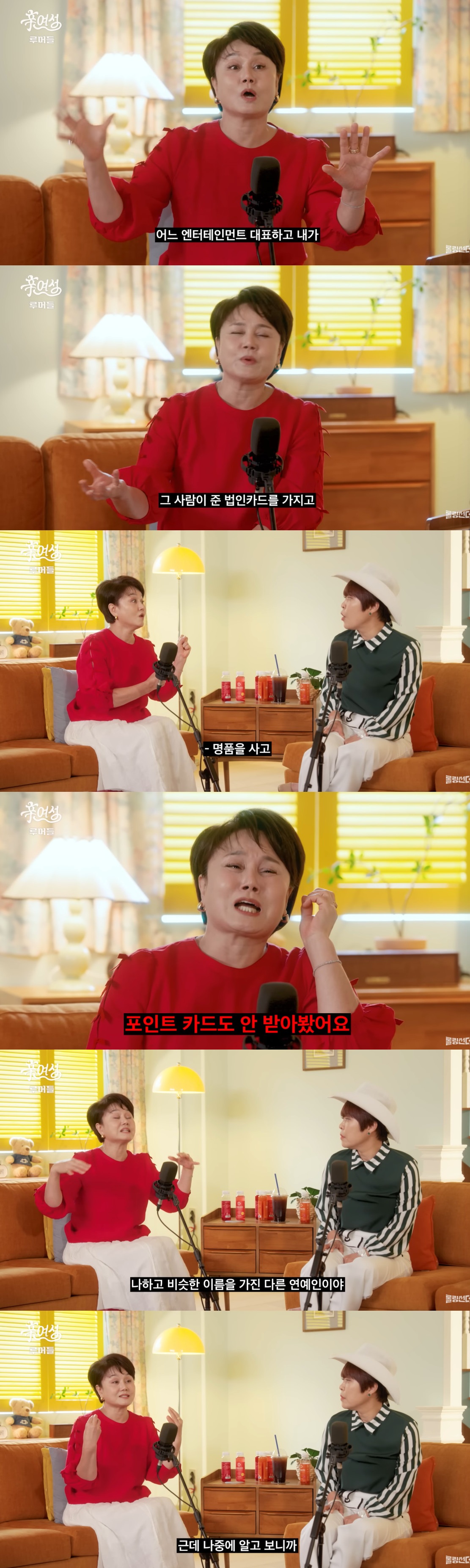 법인카드가 뭔지도 몰랐다는 이경실은 "알고보니 나와 비슷한 이름을 가진 연예인이더라. 나로 착각한 거다. 부자인 사람들과 스캔들을 만들었더라. 돈 있는 사람과 붙여줘서 괜찮다는 우스갯소리를 했었다"고 덧붙였다. 이 와중 조혜련은 "누군지 알 거 같다"며 이선민에게 실명을 언급해 웃음을 안겼다.