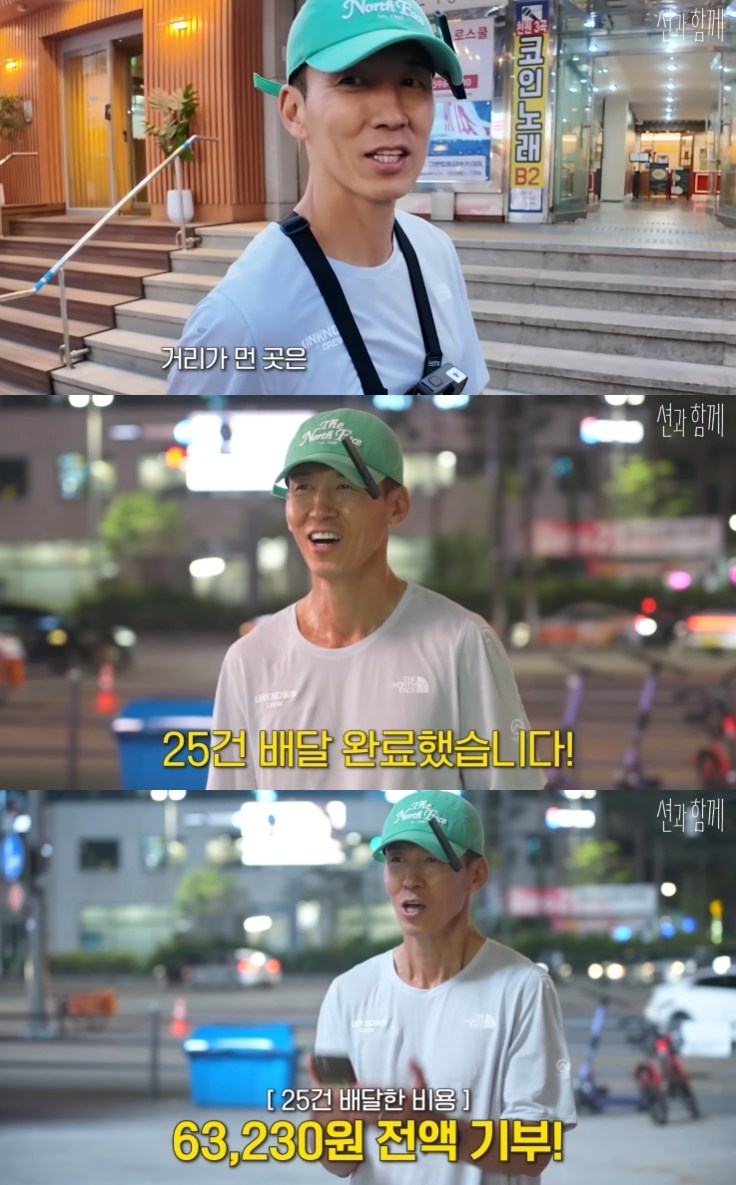 배달을 마친 션은 "정말 많은 분들이 인사해주시고, 음식 받으신 분들이 맛있게 드셨을 거라는 상상을 하면서 너무 즐거웠다"며 6만 원을 흔쾌히 기부했다.