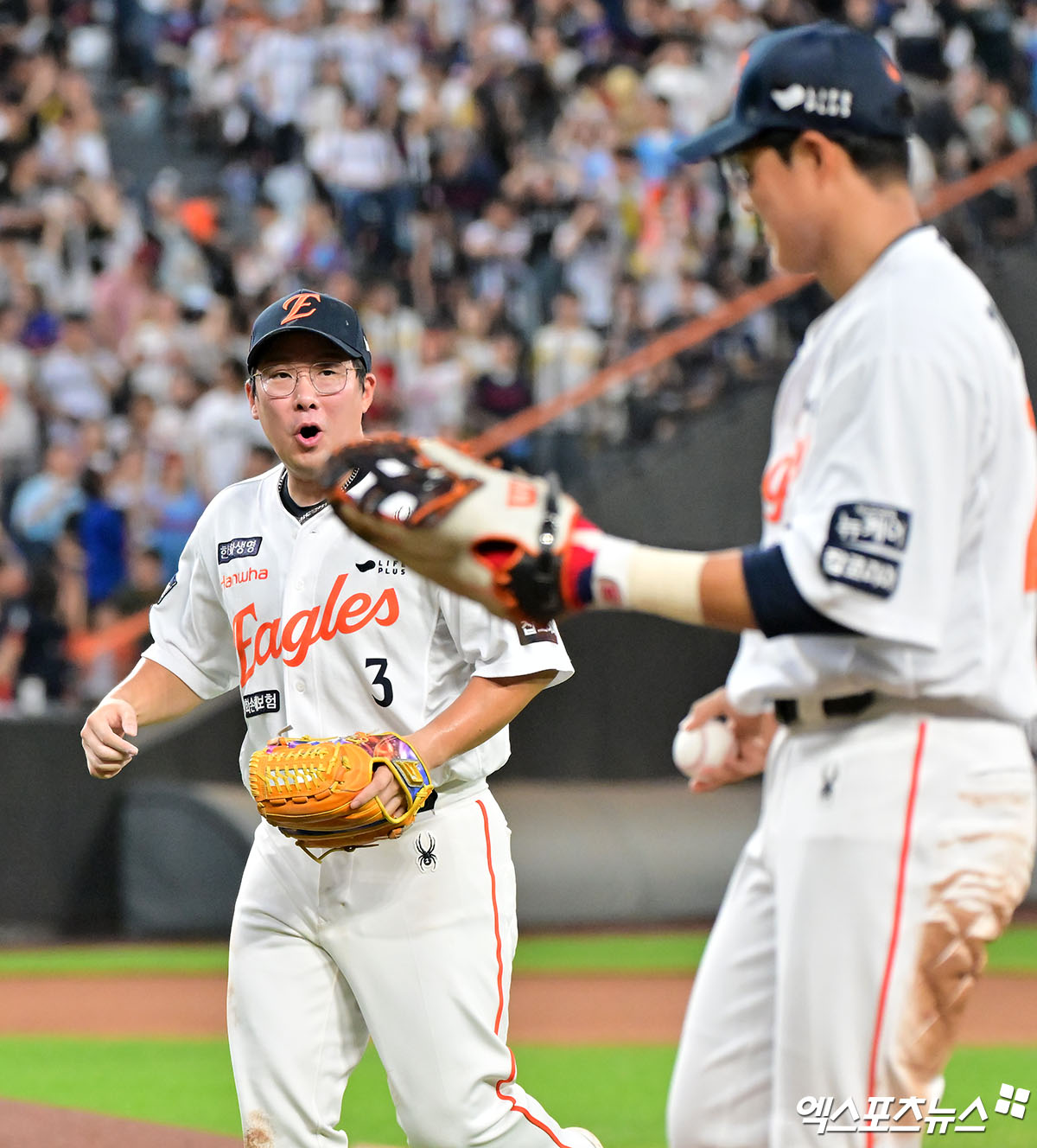(엑스포츠뉴스 대전, 김한준 기자) 14일 오후 대전 한화생명 볼파크에서 열린 '2025 신한 SOL Bank KBO리그' 롯데 자이언츠와 한화 이글스의 경기, 4회초 수비를 마친 한화 안치홍이 더그아웃으로 향하고 있다.