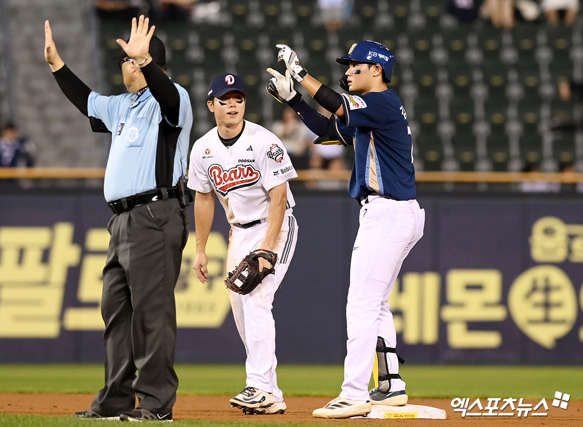 (엑스포츠뉴스 잠실, 고아라 기자) 14일 오후 서울 송파구 잠실야구장에서 열린 '2025 신한 SOL Bank KBO리그' NC 다이노스와 두산 베어스의 경기, 5회초 NC 김주원이 안타를 날린 뒤 세리머니를 하고 있다.