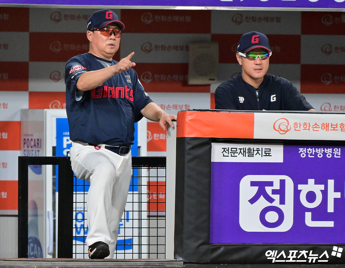 (엑스포츠뉴스 대전, 김한준 기자) 14일 오후 대전 한화생명 볼파크에서 열린 '2025 신한 SOL Bank KBO리그' 롯데 자이언츠와 한화 이글스의 경기, 8회초 1사 1루 롯데 김태형 감독이 한태양의 몸상태를 체크하고 있다.