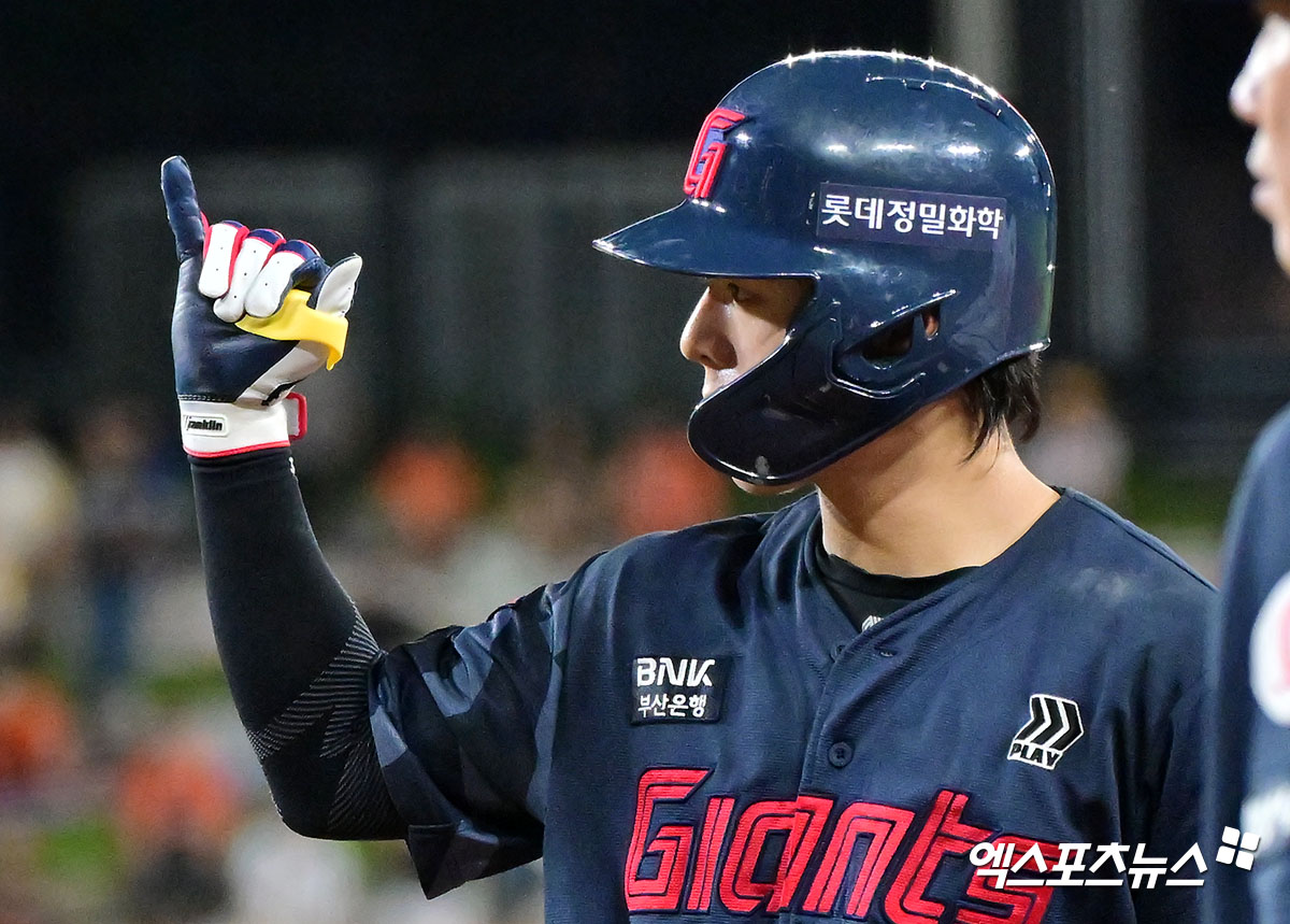 (엑스포츠뉴스 대전, 김한준 기자) 14일 오후 대전 한화생명 볼파크에서 열린 '2025 신한 SOL Bank KBO리그' 롯데 자이언츠와 한화 이글스의 경기, 10회초 롯데 한태양이 중전안타를 날리고 있다.