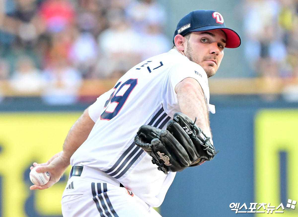(엑스포츠뉴스 잠실, 김한준 기자) 15일 오후 서울 송파구 잠실야구장에서 열린 '2025 신한 SOL Bank KBO리그' KIA 타이거즈와 두산 베어스의 경기, 1회초 두산 선발투수 잭로그가 공을 힘차게 던지고 있다.