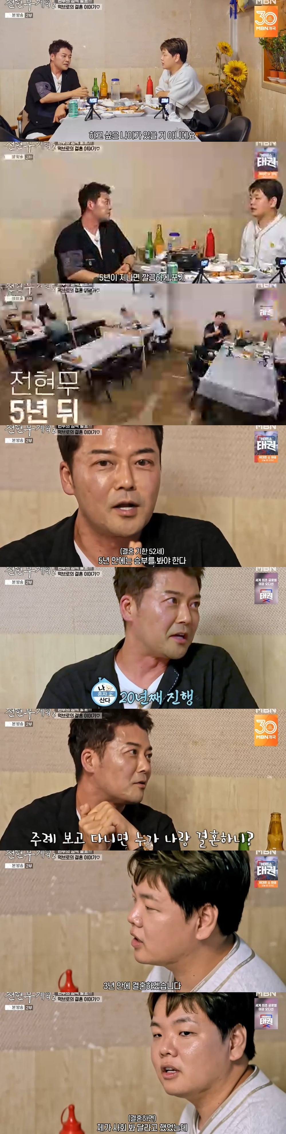 전현무는 "만약에 5년 안에 결혼을 못 하면 안 하고 살 것 같다. 결혼에 대해 실낱같이 희망을 갖고 있다면 5년 안에 승부를 봐야 할 것 같다. 5년 뒤에도 미혼 상태면 비혼 선언"이라고 말했다. 그러면서 "'나혼산' 20년째 진행"이라고 덧붙이며 너스레를 떨어 웃음을 자아냈다.