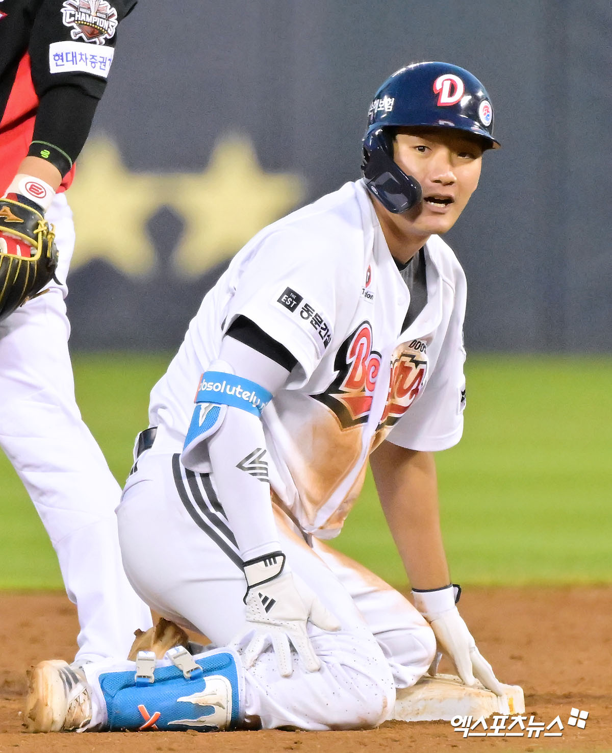 (엑스포츠뉴스 잠실, 김한준 기자) 15일 오후 서울 송파구 잠실야구장에서 열린 '2025 신한 SOL Bank KBO리그' KIA 타이거즈와 두산 베어스의 경기, 4회말 1사 3루 두산 안재석이 1타점 2루타를 날리고 있다.