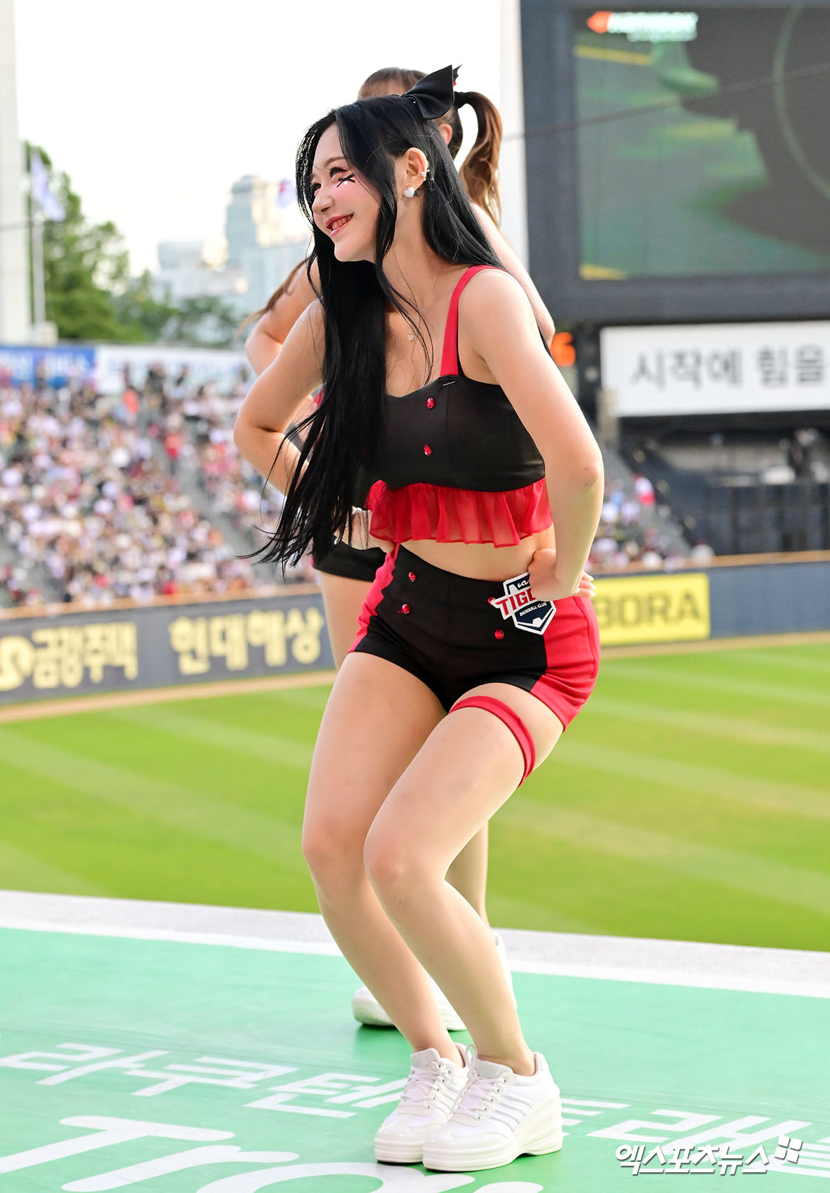 (엑스포츠뉴스 잠실, 김한준 기자) 15일 오후 서울 송파구 잠실야구장에서 열린 '2025 신한 SOL Bank KBO리그' KIA 타이거즈와 두산 베어스의 경기, 유세리 치어리더가 멋진 공연을 선보이고 있다.