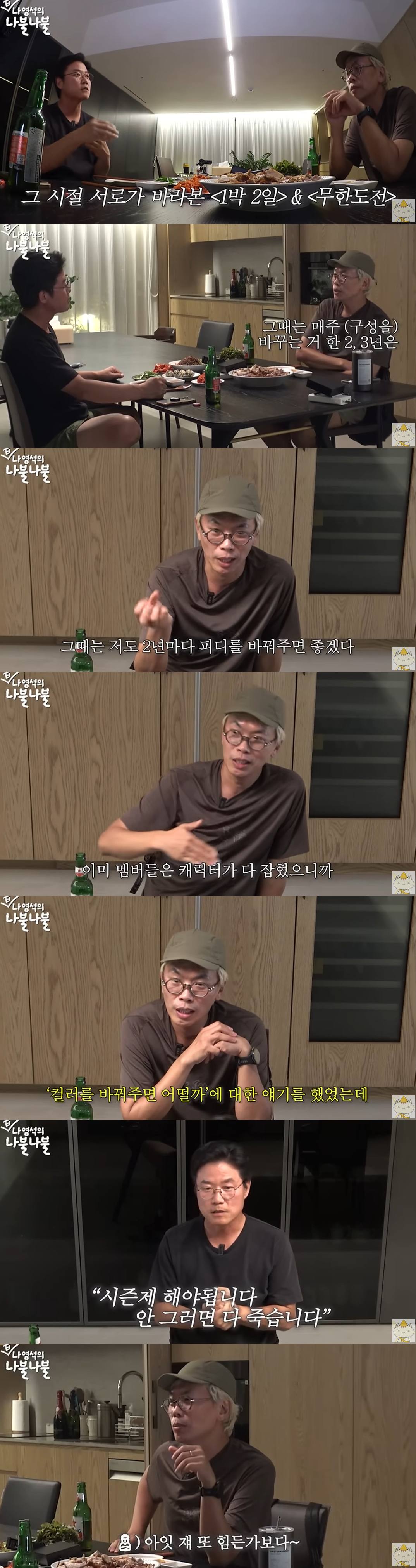 나영석은 "늘 안된다 그러죠. 1박 끝났을 때도, 끝나기 전에도 KBS에 계속 얘기했던 게 '시즌제 해야 됩니다. 안 그러면 다 죽습니다' 얘기했었다"라고 말했다. '1박 2일'을 하차하던 2011년, 그 이전부터 시즌제의 필요성을 어필해왔다고. 이어 "지금 결국은 시즌제 많이 하지만 그때는 받아들여지지 않았다"라고 말했다.