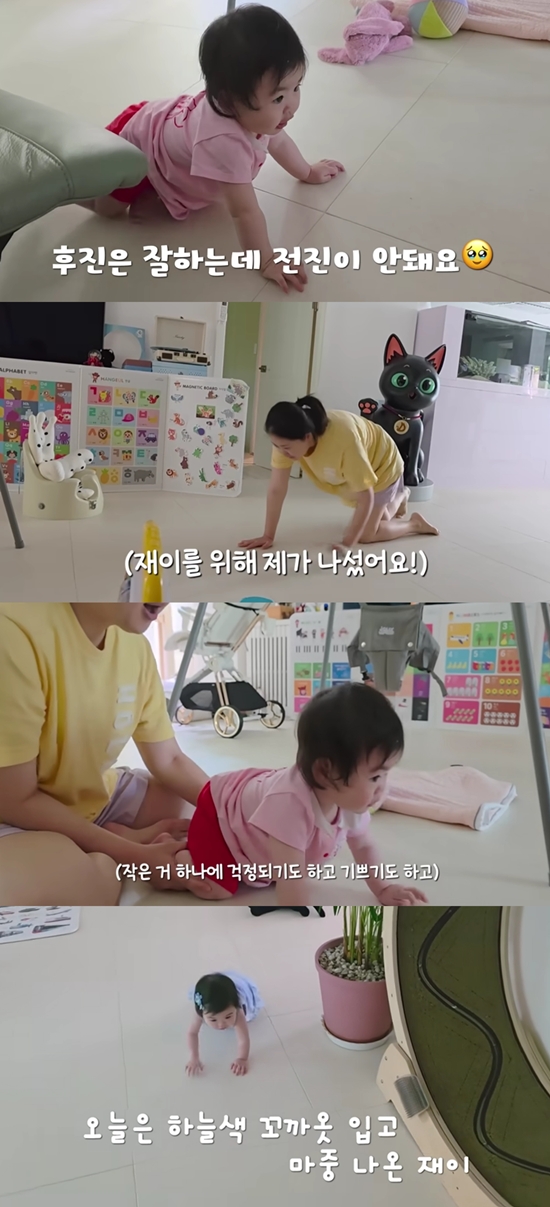 하지만 재이의 네발기기는 쉽지 않았고, 김다예는 집 안을 네 발로 기어다니며 직접 시범을 보여줬다. 그리곤 재이의 발을 붙잡고 재이가 손을 이용해 앞으로 나아가게끔 도왔다.