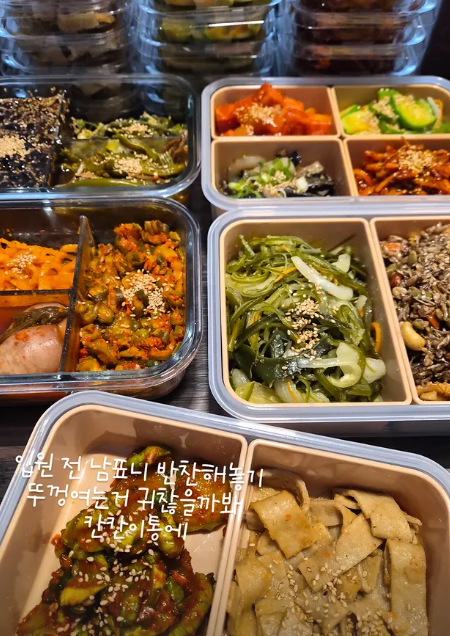 사진에는 애호박볶음, 깍두기, 어묵볶음, 콩자반, 꽈리고추볶음, 고사리나물 등 보기만 해도 군침이 도는 반찬들이 통에 정갈하게 담겨 있다.