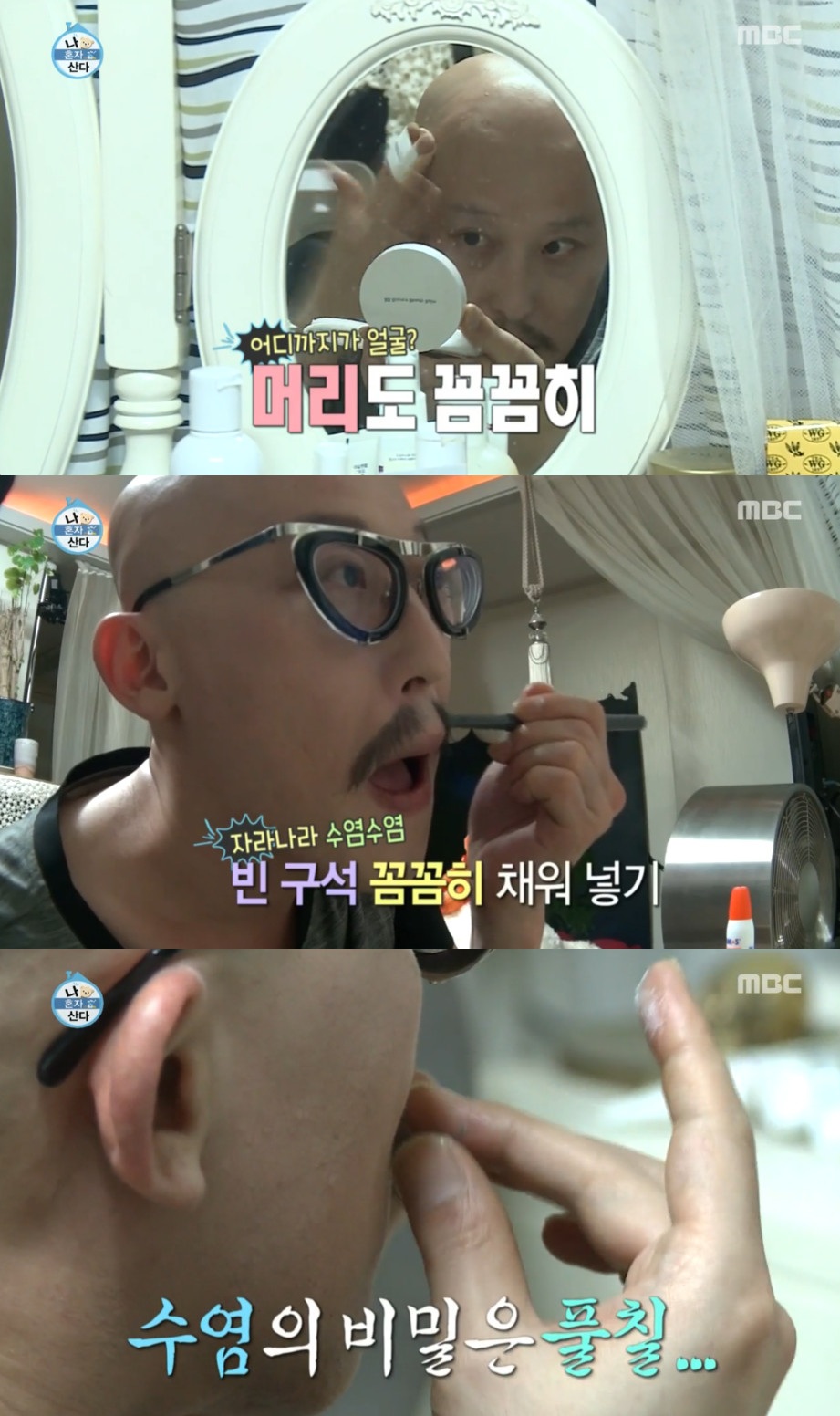 과거 황재근은 피부 메이크업을 하며 두피까지 관리를 하는가 하면, 수염의 빈 공간을 채우는 메이크업부터 목공풀로 스타일링을 완성하는 모습을 공개한 바 있다.