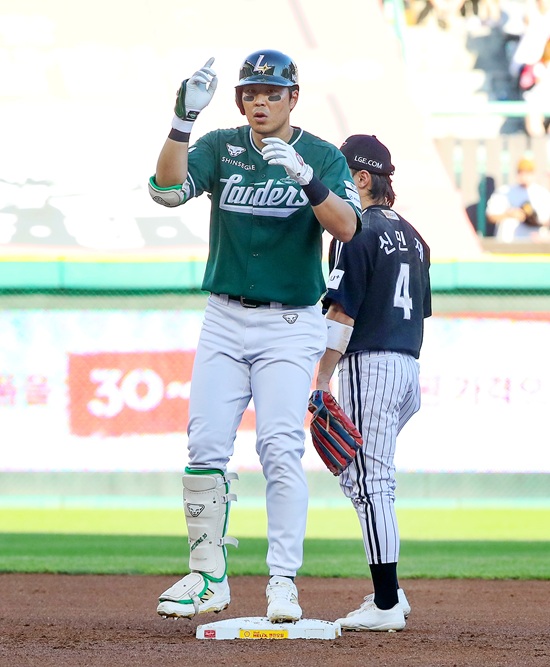 이어진 타석 한유섬이 좌측 큰 뜬공을 날려보냈는데, 좌익수 김현수가 낙구 지점을 놓치면서 타구가 담장 바로 앞에 떨어졌다. 그 사이 1루에 있던 박성한이 홈 베이스를 밟으면서 SSG가 한 점을 따라붙었다.