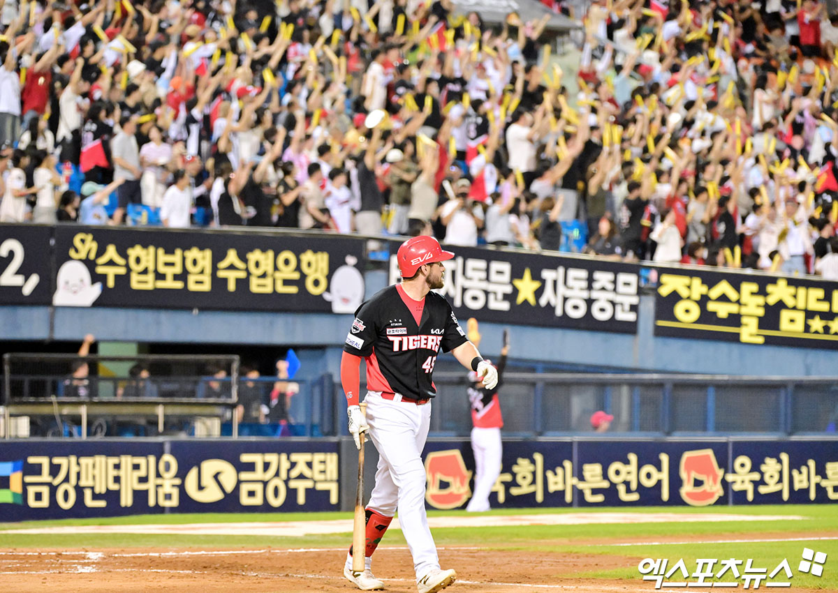 (엑스포츠뉴스 잠실, 김한준 기자) 16일 오후 서울 송파구 잠실야구장에서 열린 '2025 신한 SOL Bank KBO리그' KIA 타이거즈와 두산 베어스의 경기, 9회초 1사 KIA 위즈덤이 솔로 홈런을 날리고 있다.