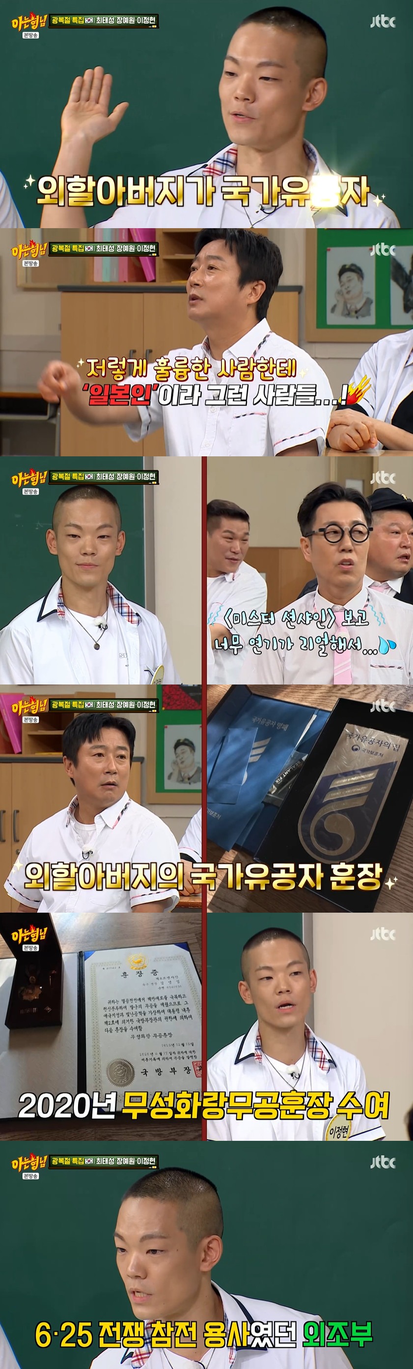 이에 김영철은 "'미스터 션샤인' 보고 너무 연기가 리얼해서"라고 해명했고, 이어 이정현은 "돌아가시고 나서 2020년도에 무성화랑무공훈장이라는 훈장을 받았다"며 외조부가 6.25 전쟁 참전 용사라고 전했다.