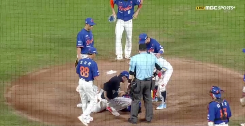그런데 이어진 최정원과의 승부, 볼카운트 1-1에서 타격한 최정원의 타구가 문동주에게 향했다. 타구는 문동주의 오른팔을 때렸고, 공에 맞은 문동주는 마운드에 쓰러져 고통을 호소했다. 트레이닝 코치는 물론 양상문 투수코치와 야수들까지 모두 마운드로 달려나와 문동주의 상태를 살폈다.