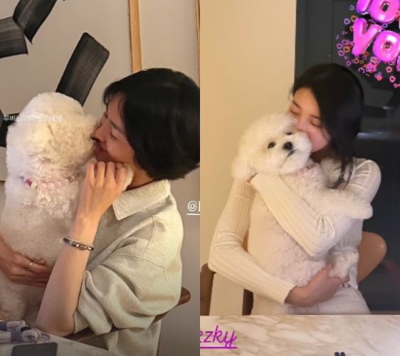 공개된 사진 속 수지는 송혜교의 반려견 루비를 안고 있으며 두 눈을 꼭 감은 채 뽀뽀하고 있는 모습이다.