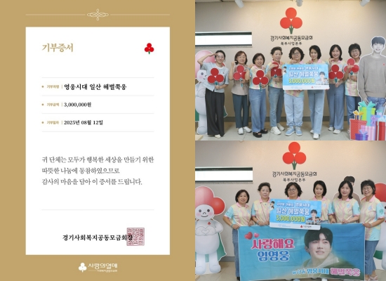 최근 임영웅 팬클럽 '영웅시대 일산 헤벌쭉웅'은 8월 12일 경기사회복지공동모금회(회장 권인욱) 북부사업본부(경기북부 사랑의열매)에 성금 300만 원을 기부했다고 밝혔다.