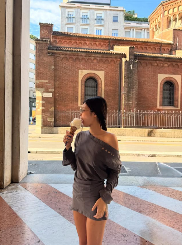 뿐만 아니라 거리에서는 오프숄더 드레스로 세련된 스타일을 연출하며 아이스크림을 즐기는 모습마저 스타일리시하게 소화했다. 무대 위 강렬한 카리스마와 달리 자연스러운 일상 속 패션마저 런웨이를 연상케 하며 ‘글로벌 패션 아이콘’다운 존재감을 드러냈다.
