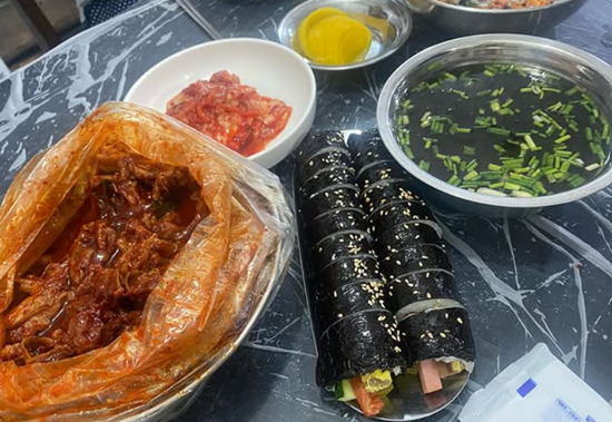 사진 속 김하영은 지인들과 닭발집을 찾은 모습. 테이블 위에는 닭발과 김밥 등이 놓여 있어 절로 군침을 돌게 한다.