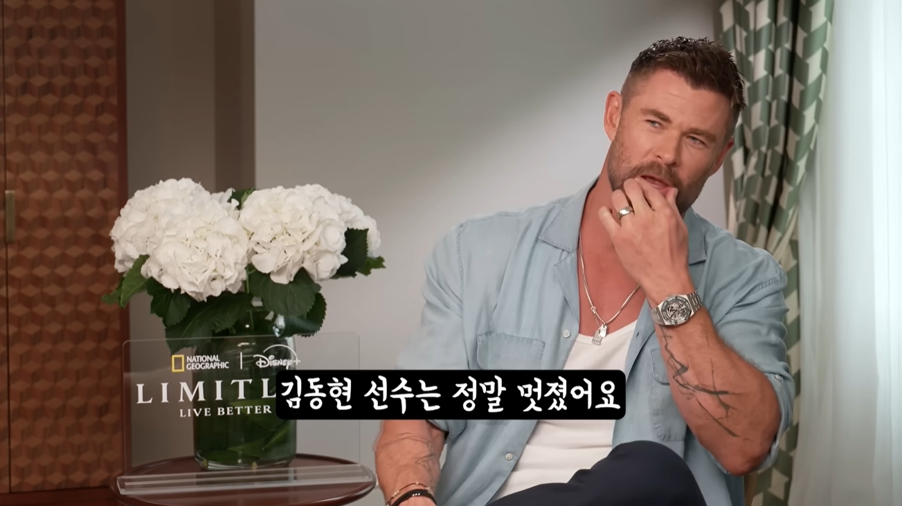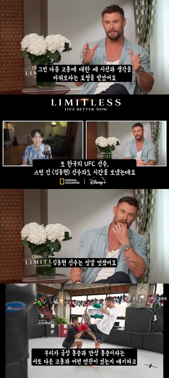 크리스 헴스워스는 "고통에 목적성이 있고 그 고통의 이유를 알고 있다면, 그걸 극복할 수 있다더라. 정말 고통스러운 건 그 고통을 통해 얻는 것이 없고, 그래서 고통의 목적을 찾을 수 없을 때다. 김동현은 그걸 승리와 패배에 연관시키더라"며 "'경기에서 이기긴 했는데 코가 부러지거나 팔이 부러졌을 수도 있다. 그건 영광스러운 고통이고 문제가 되지 않는다'고 했다"고 이야기했다.