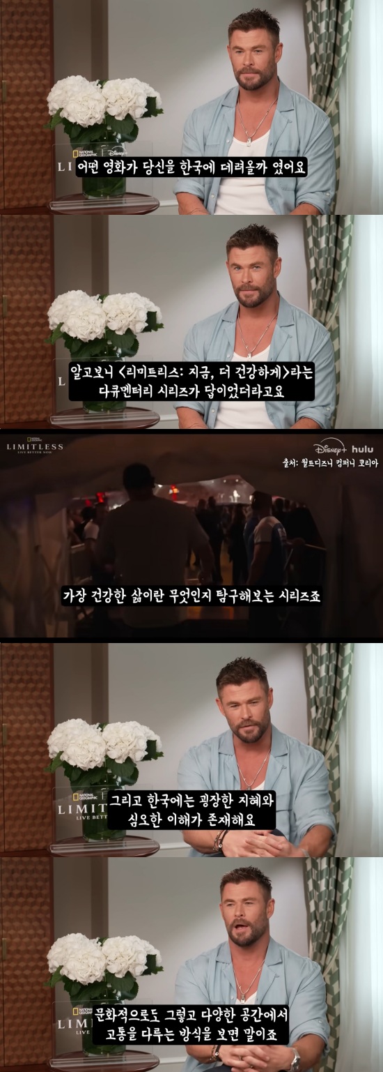 최근 천재이승국 유튜브 채널에는 '극비로 한국에 와서 희한한 다큐 찍은 크리스 헴스워스에게 물어본 것들 (feat. 리미트리스 인터뷰)'라는 제목의 영상이 게재됐다.