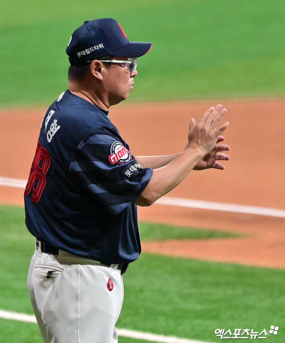 김태형 감독은 "김원중이 지난 17일 삼성전에서 직구도 한 번 던지고 싶었던 것 같다. 어떻게 보면 감독이 (포크볼을 던지라고) 지시를 한 거다. 그냥 선수에게 맡겼어도 되지 않았을까 하는 아쉬움도 있다"며 "4점 차였기 때문에 김영웅을 (볼넷으로) 보내도 되겠다고 판단했다. 김원중이 포크볼을 원 바운드성으로 떨어뜨리길 바랐다"고 설명했다.