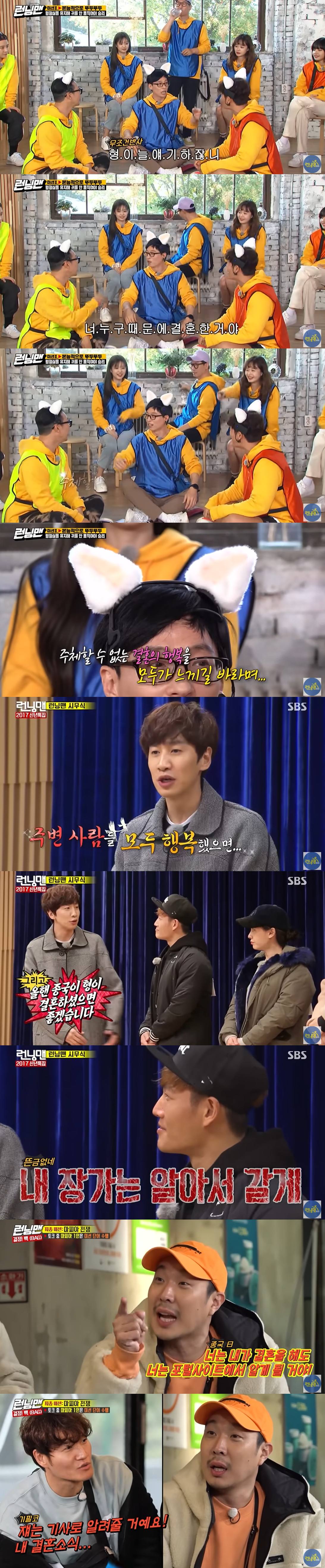 이어진 영상은 2017년 신년 특집, 이광수는 "올해는 저희 모두 행복하고 저희 가족들 행복하고 시청자분들도 행복하시고. 개인적으로 형이 결혼하셨으면 좋겠다"라며 김종국을 언급했다.