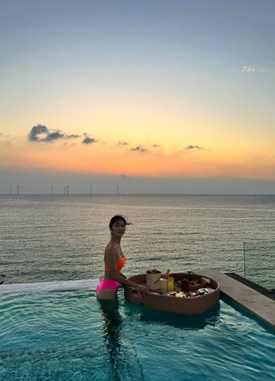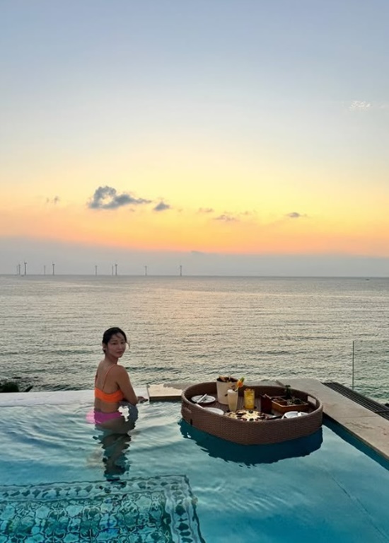 공개된 사진에는 주홍빛과 핑크빛 등 형광색이 돋보이는 비키니로 패션을 완성한 한그루가 바닷가 앞에서 여유롭게 만찬을 즐기고 있는 모습이 담겨 있다.