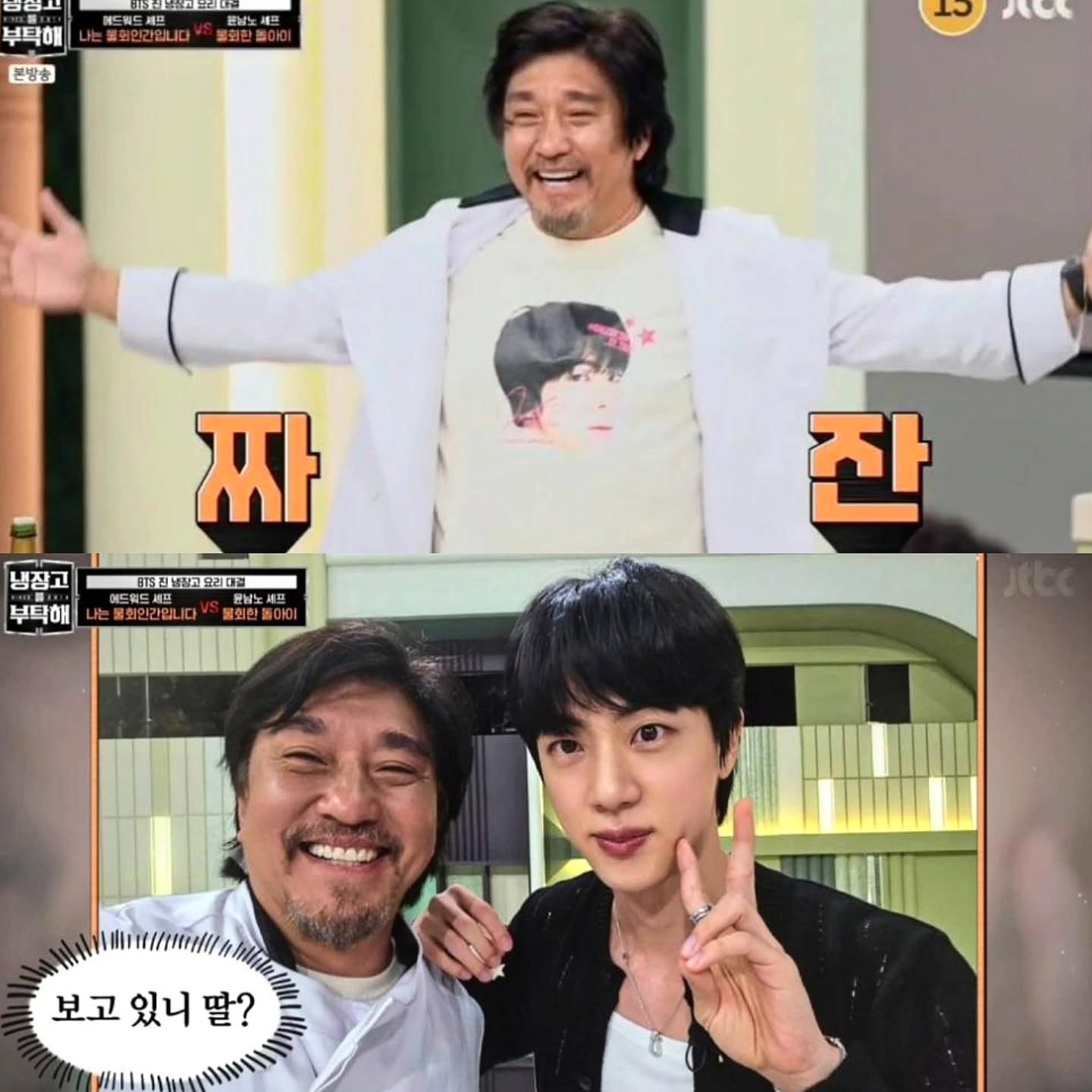 공개된 사진에는 '냉부해' 출연 당시 요리를 마친 뒤 진의 얼굴이 프린팅된 티셔츠를 입고 있는 걸 인증하는 퍼포먼스를 보여준 에드워드 리와 더불어 진과 셀카를 찍은 그의 모습이 동시에 담겼다.