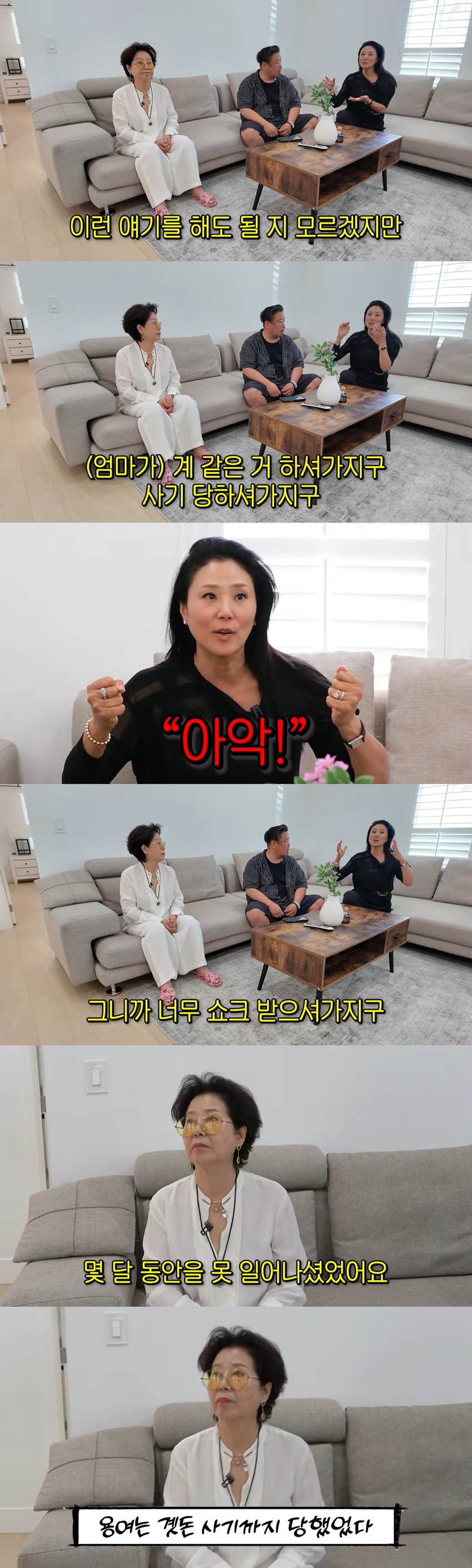 과거 미국에서 식구가 함께 생활 중이던 과거를 회상하던 중, 딸은 "이런 얘기를 해도 될지 모르겠지만 (엄마가) 계 같은 거를 하셔서 사기를 당하셨다. 운전하고 가는데 그 얘기를 딱 듣고 엄마가 '악' 이러더라. 너무 쇼크 받으셔서 몇 달 동안을 못 일어나셨다"고 전해 눈길을 끌었다.
