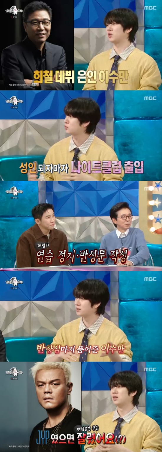 이에 김구라는 "JYP 연습생이었으면 바로 잘렸을 것"이라고 했고, 김희철도 "맞다. 그랬을 거다. 그런데 이수만 선생님은 '얘는 아티스트가 될 애라서 사고는 안 칠거야'라고 하셨었다. 그래서 데뷔 20주년 기념으로 엄청 비싼 와인을 선물로 드렸다"고 말하며 고마워했다.