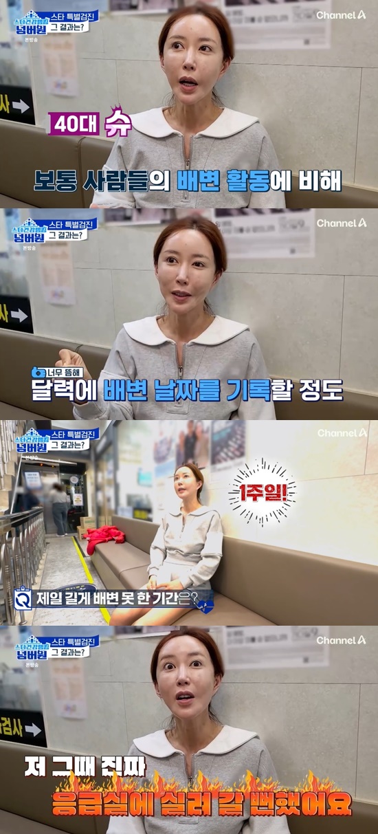 건강검진을 받던 슈는 배변 활동이 원활하지 않다고 말하며 "배변이 너무 뜸해 달력에 날짜를 기록할 정도다. 일주일 간 배변을 못 할 때도 있었고, 그 때는 진짜 응급실에 실려갈 뻔했다"고 말했다.
