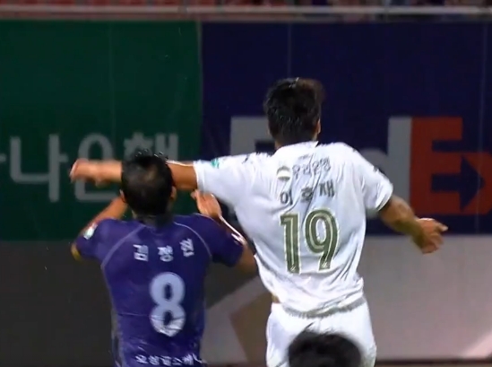 반대로 이호재는 전반 추가시간 4분경 상대 선수와 공중볼 경합 과정에서 팔꿈치로 상대 선수의 안면을 가격했다. 당시 주심은 파울 선언과 함께 이호재에게 경고를 줬다.